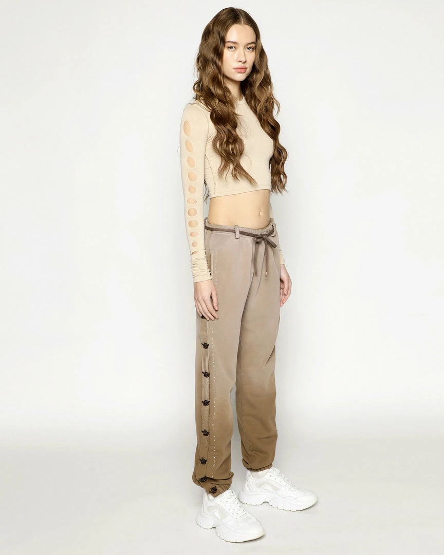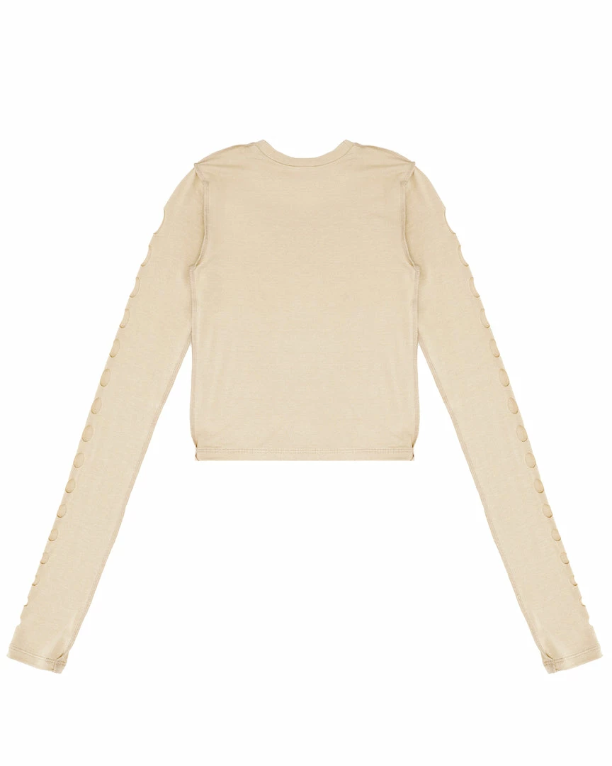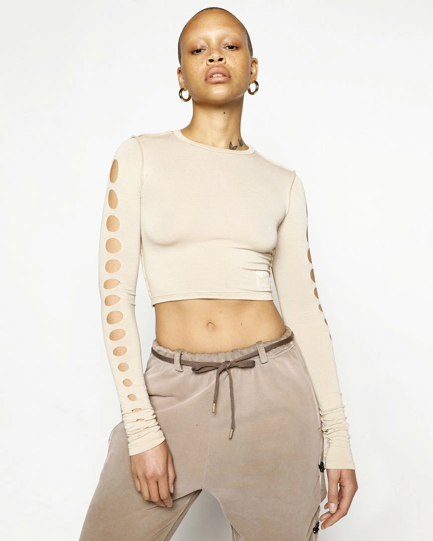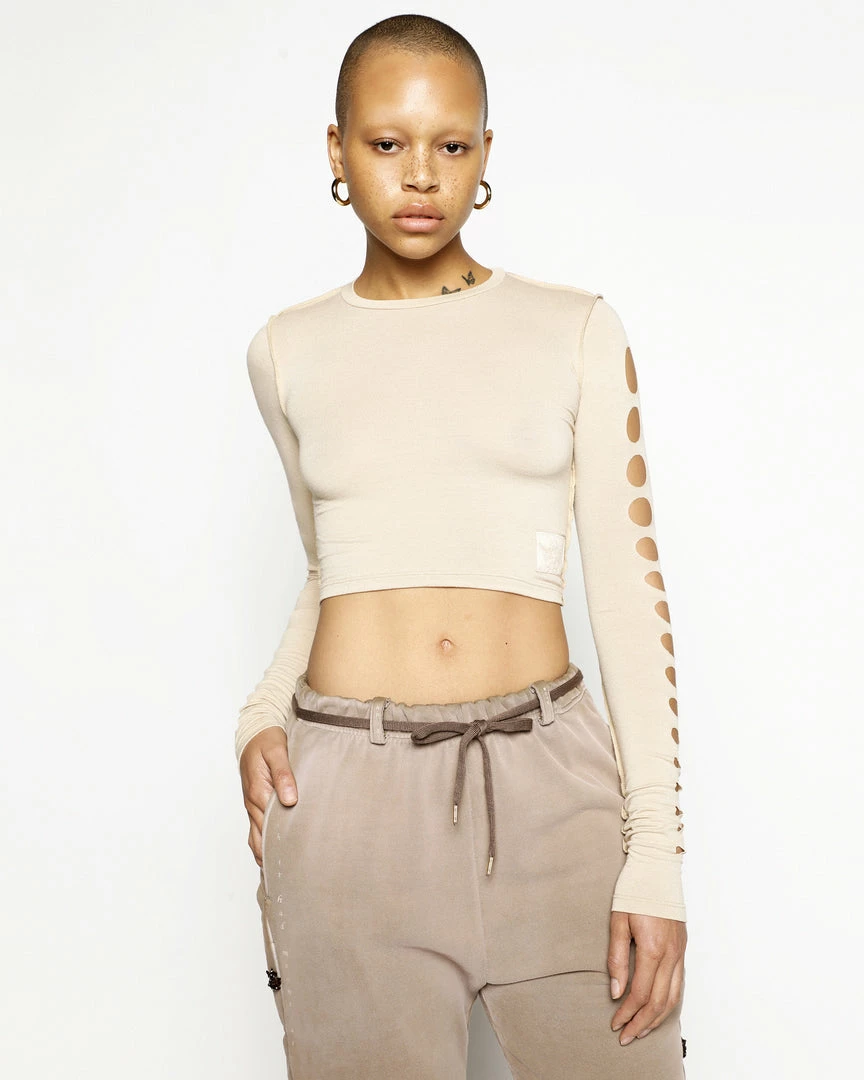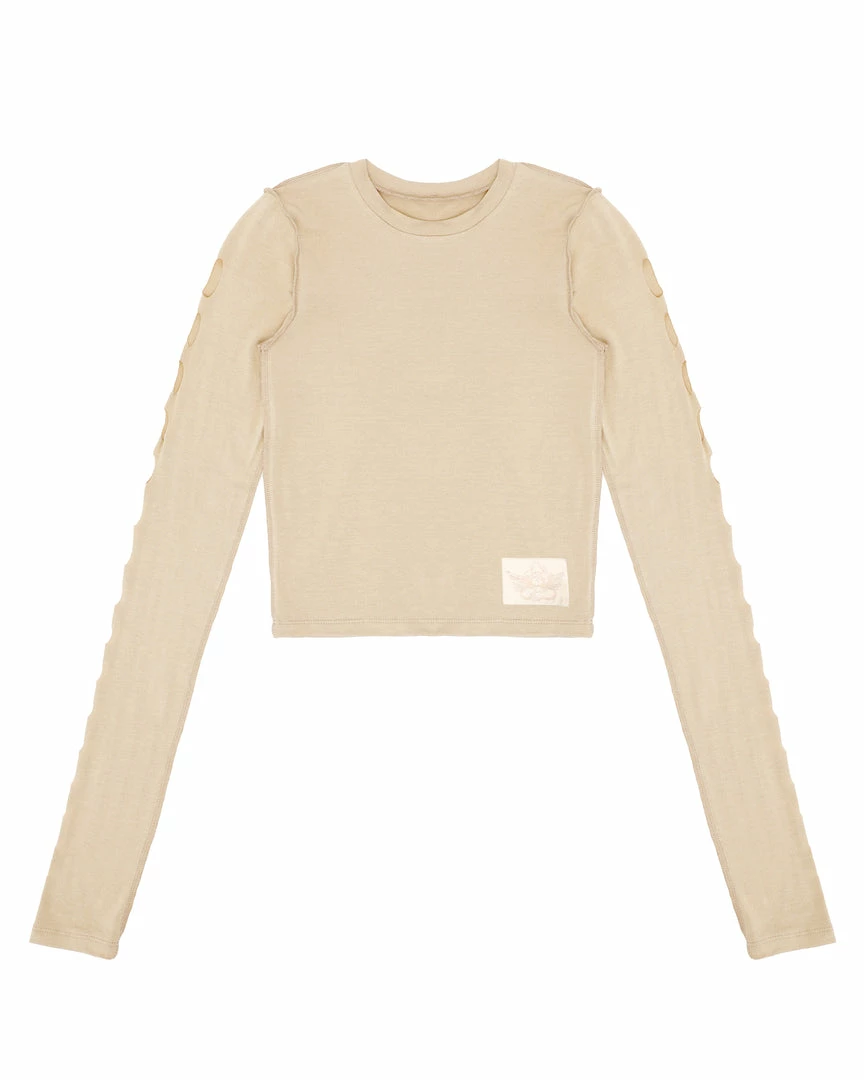 Lightweight and slightly sheer crepe fabric long sleeve. Cropped hemline, cutout holes down the sleeves, exposed seams, and Ariel x Boys Lie logo patch.Β Made in Los Angeles, California.Β