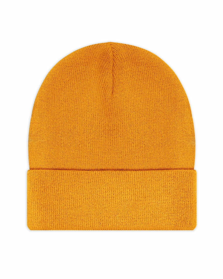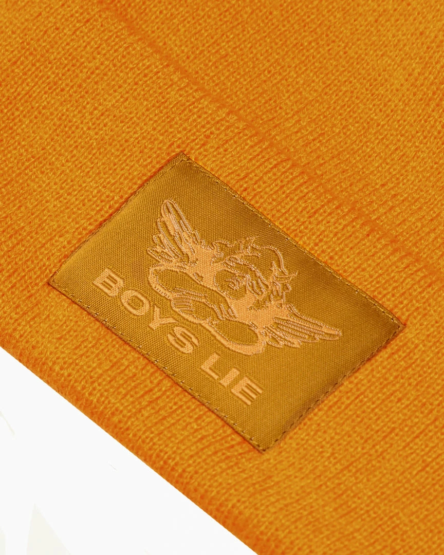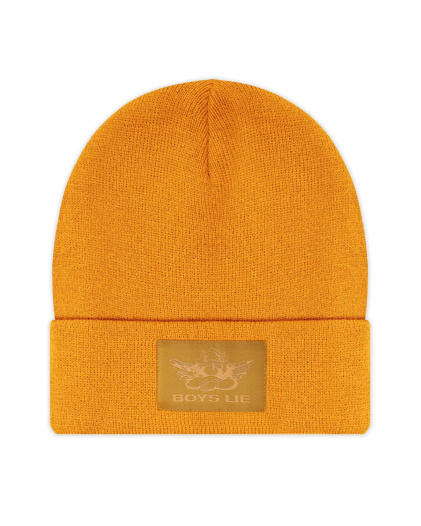 Gold beanieΒ with monochromatic Boys Lie logo patch.
