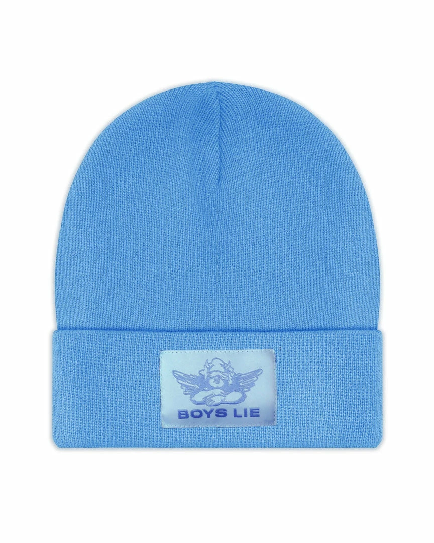BlueΒ beanieΒ withΒ blueΒ Boys Lie logo patch.