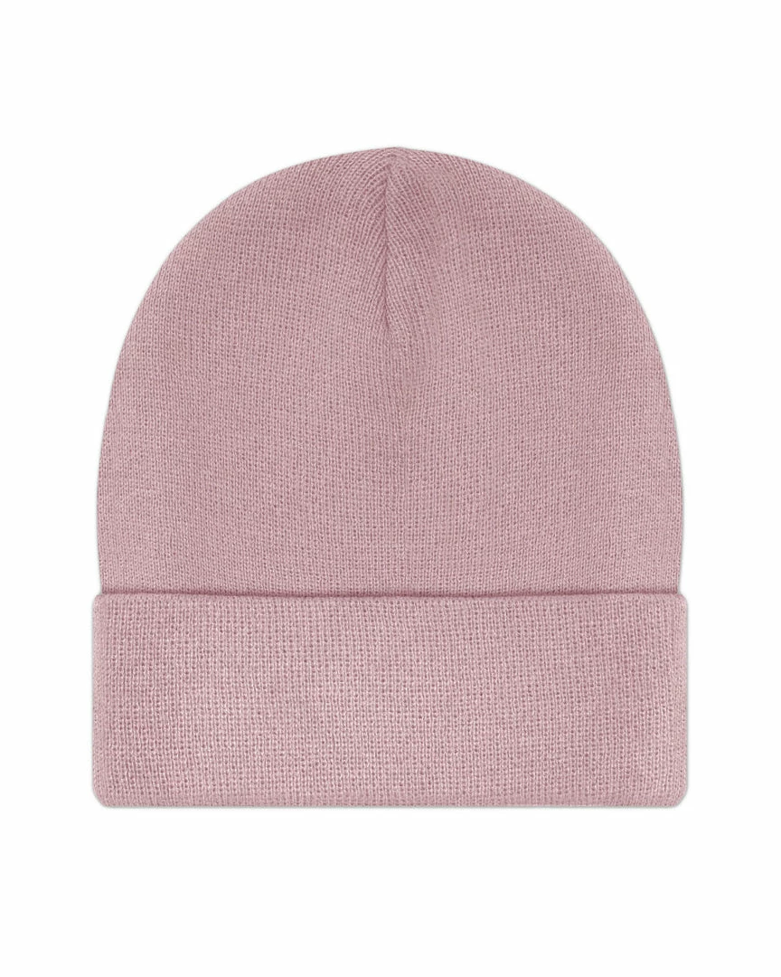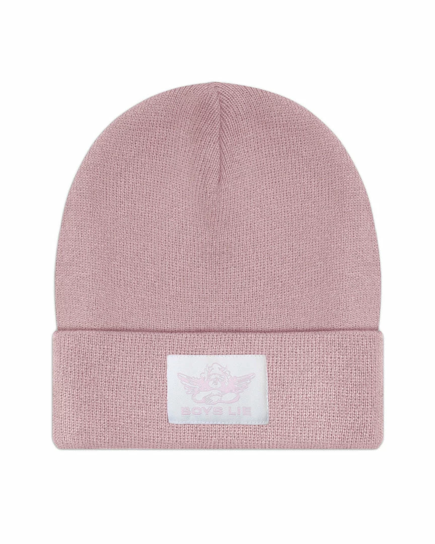 Mauve pink beanieΒ withΒ light Boys Lie logo patch.