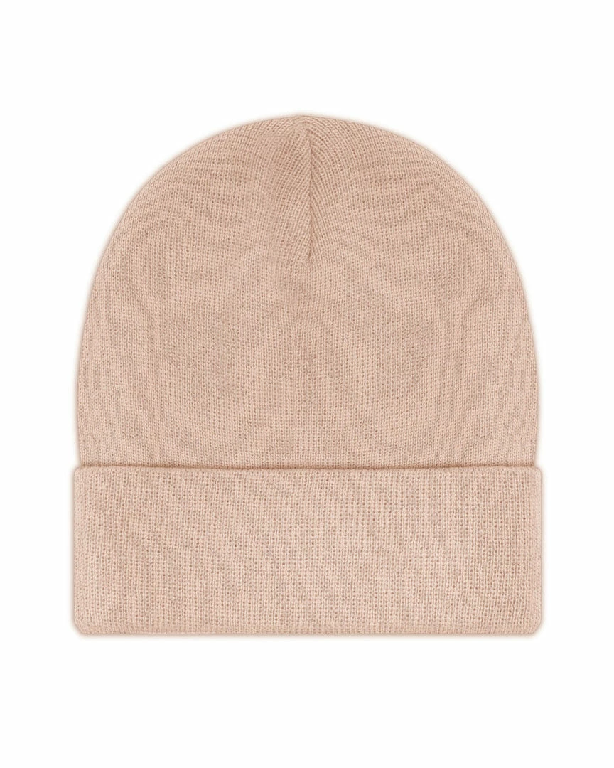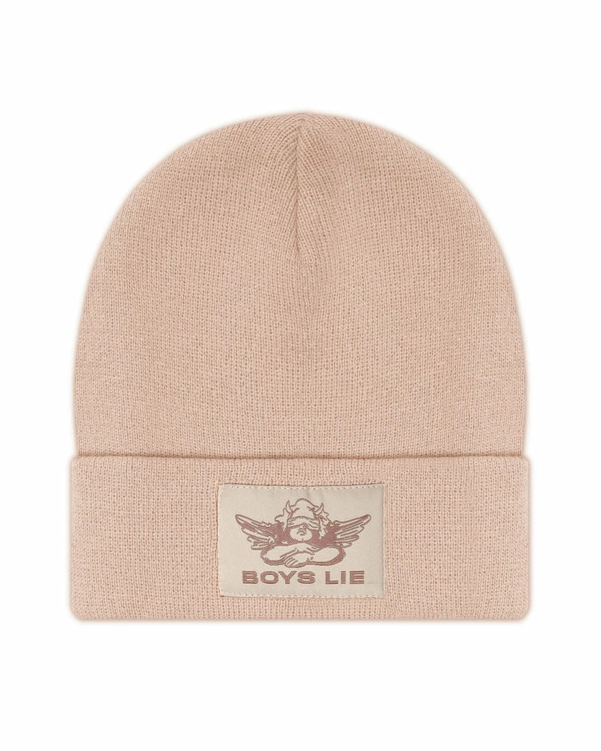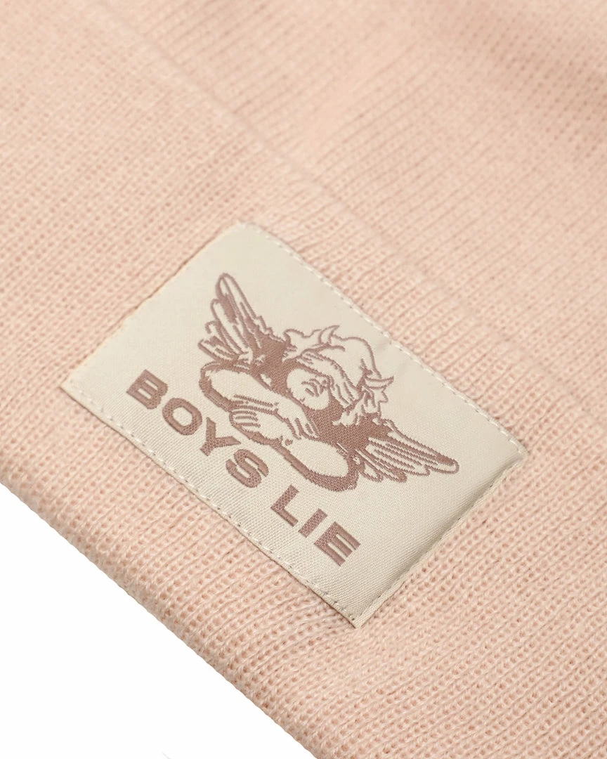 Pink beige beanieΒ with monochromatic pink Boys Lie logo patch.