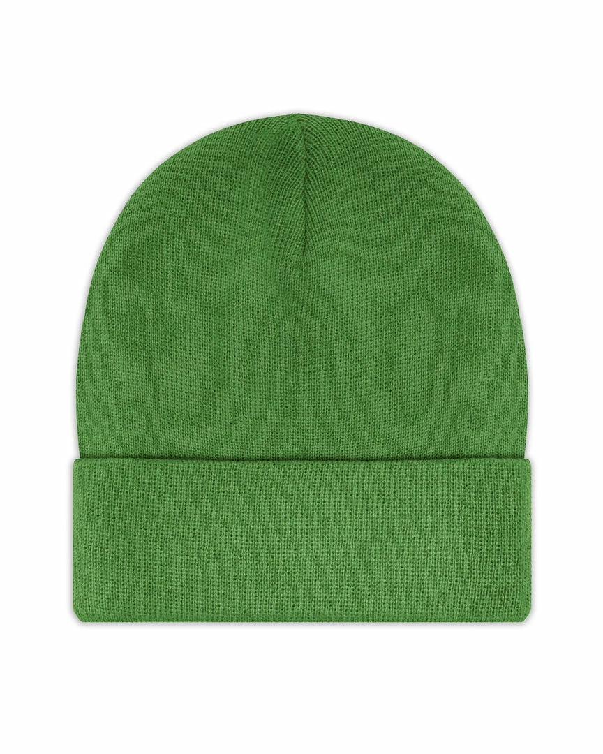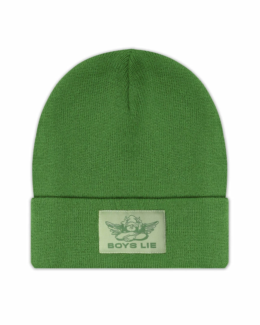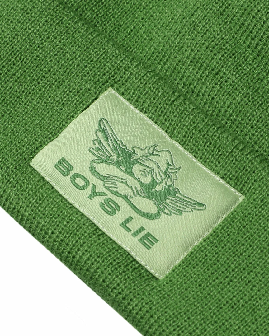 Olive greenΒ beanieΒ with monochromaticΒ olive Boys Lie logo patch.
