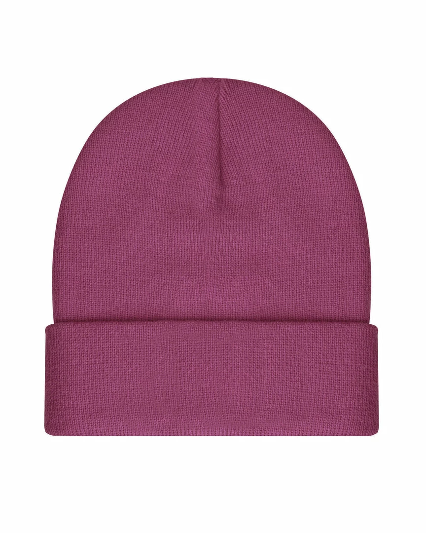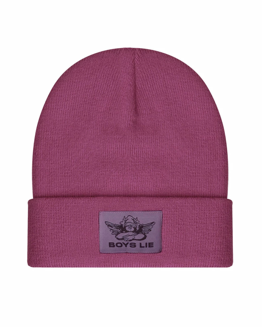 MagentaΒ beanieΒ withΒ purple Boys Lie logo patch.