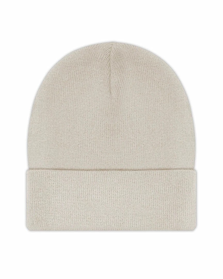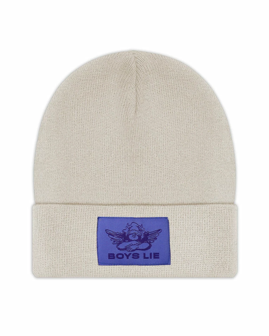 Light taupeΒ beanieΒ withΒ purple Boys Lie logo patch.