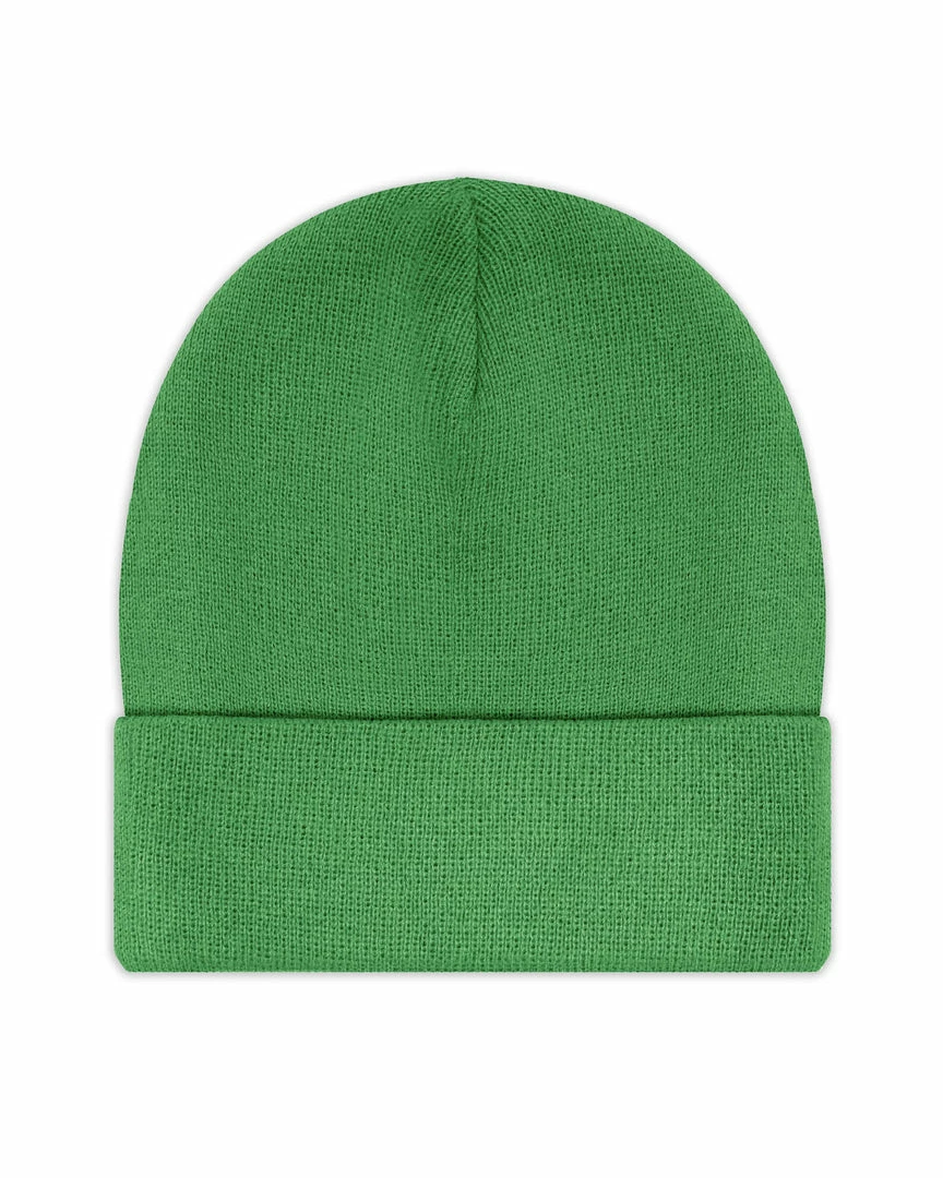 GreenΒ beanieΒ with orange Boys Lie logo patch.