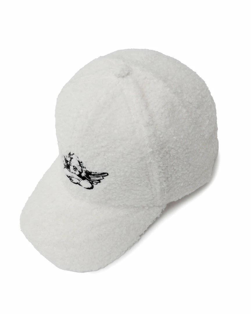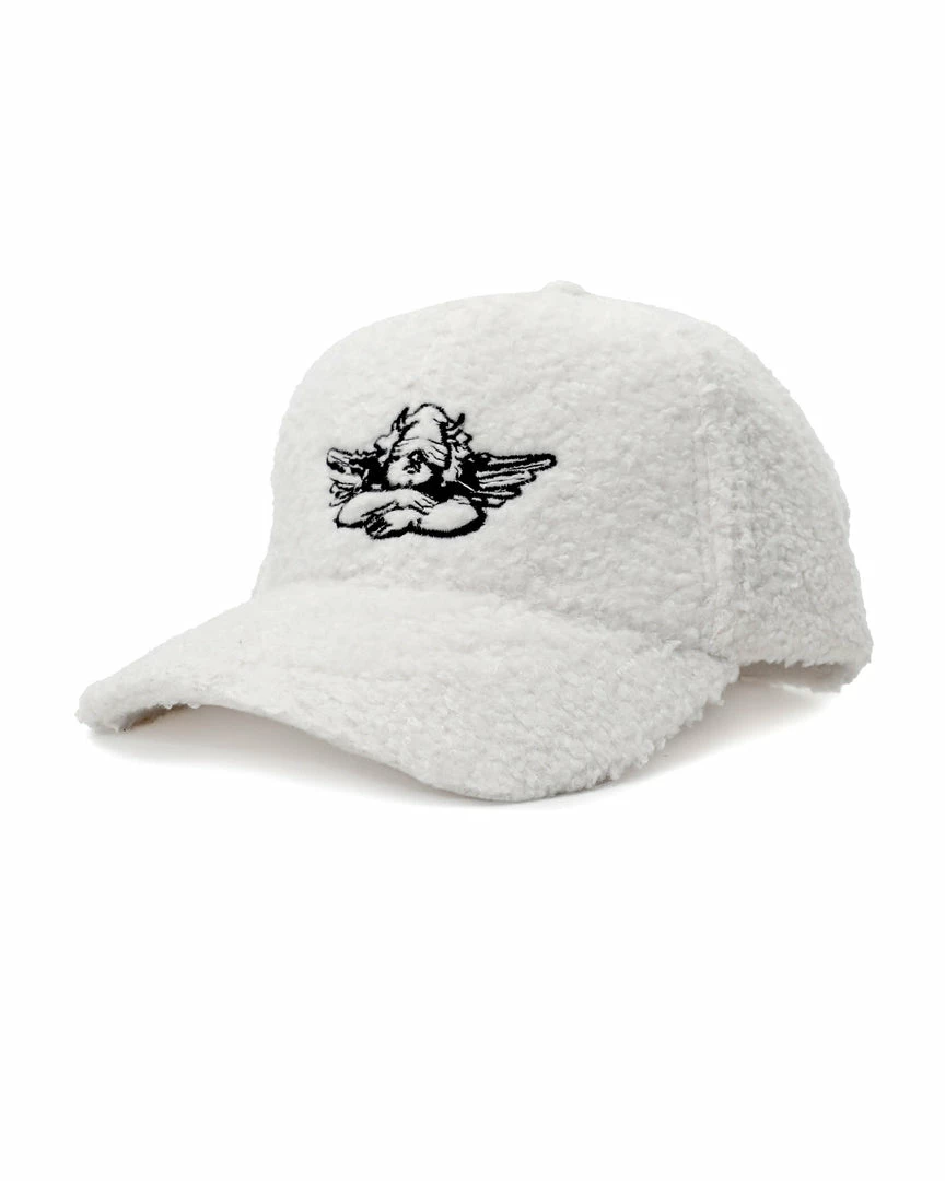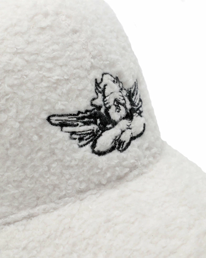 Faux cream sherpa baseball hat with black Boys Lie cherub logo and an adjustable velcro strap.Β