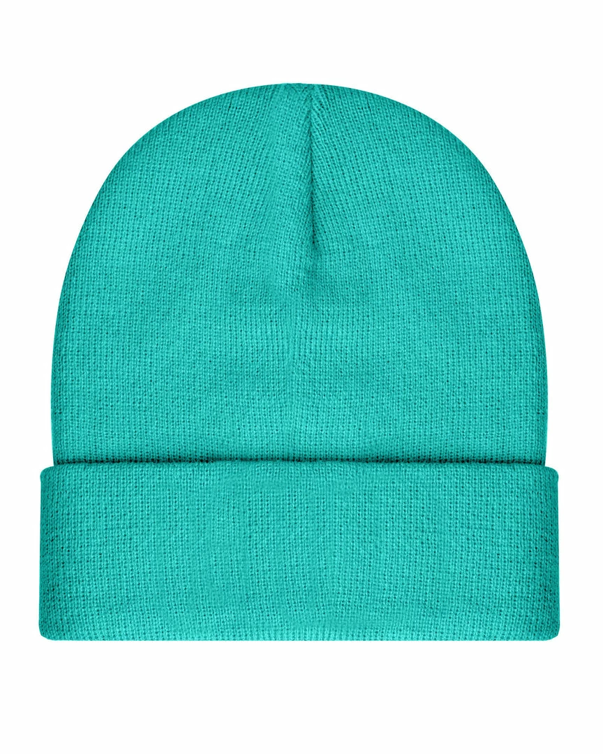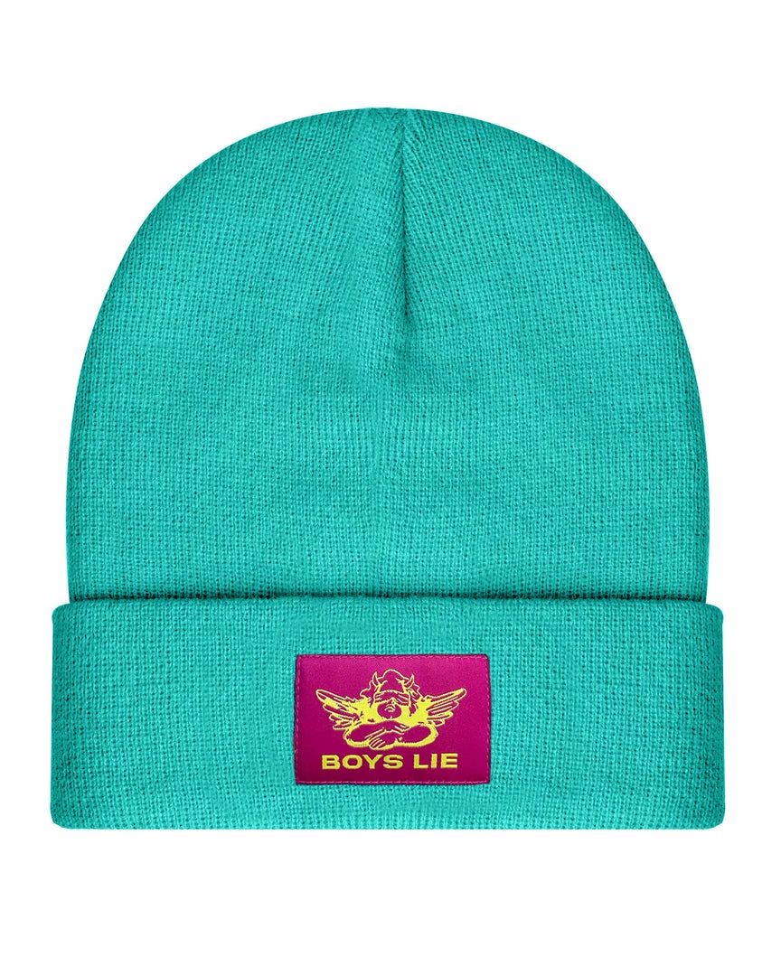 TealΒ beanieΒ with fuschia Boys Lie logo patch.