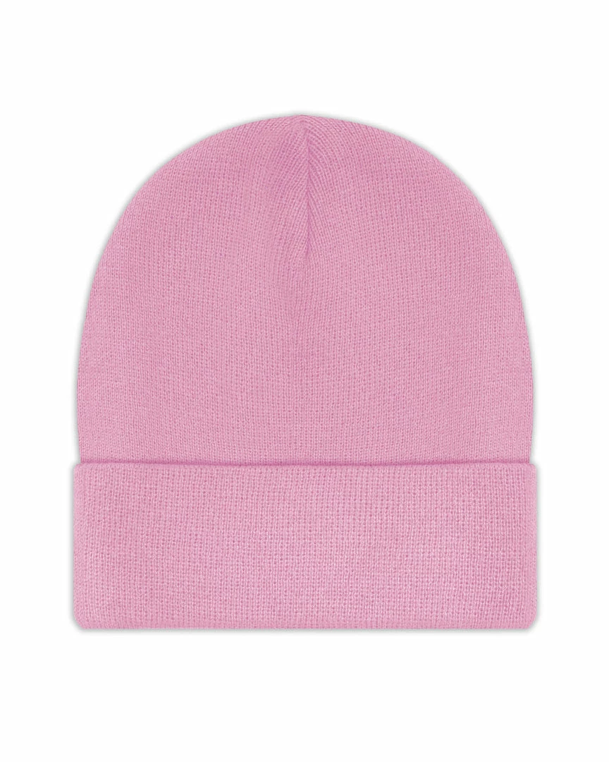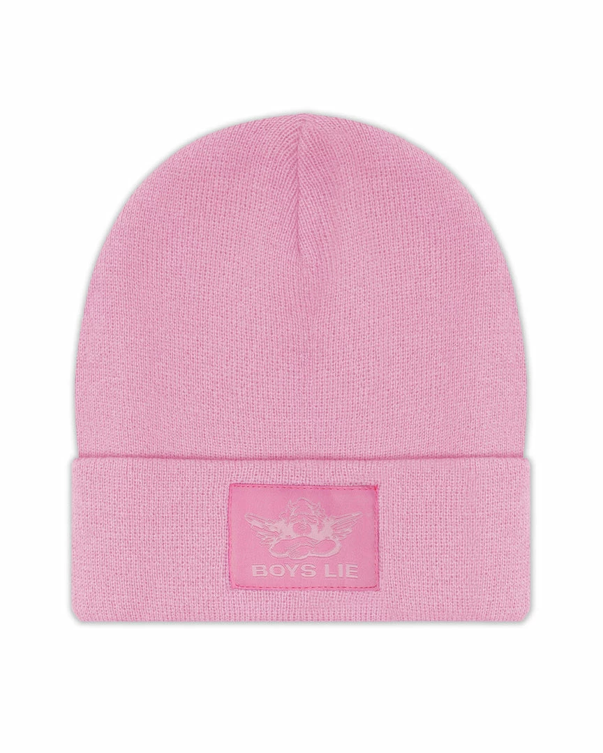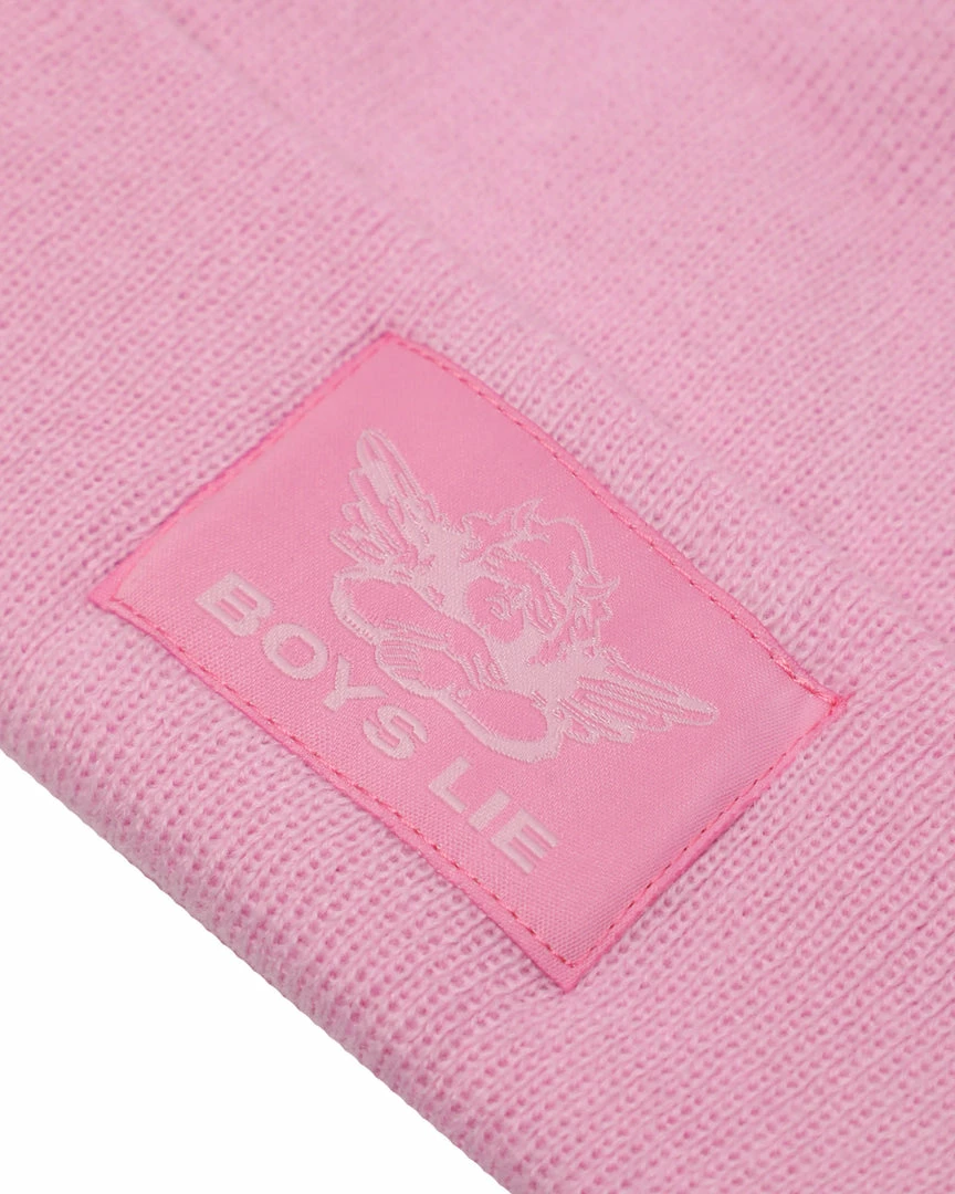 Pink beanieΒ with monochromatic pink Boys Lie logo patch.