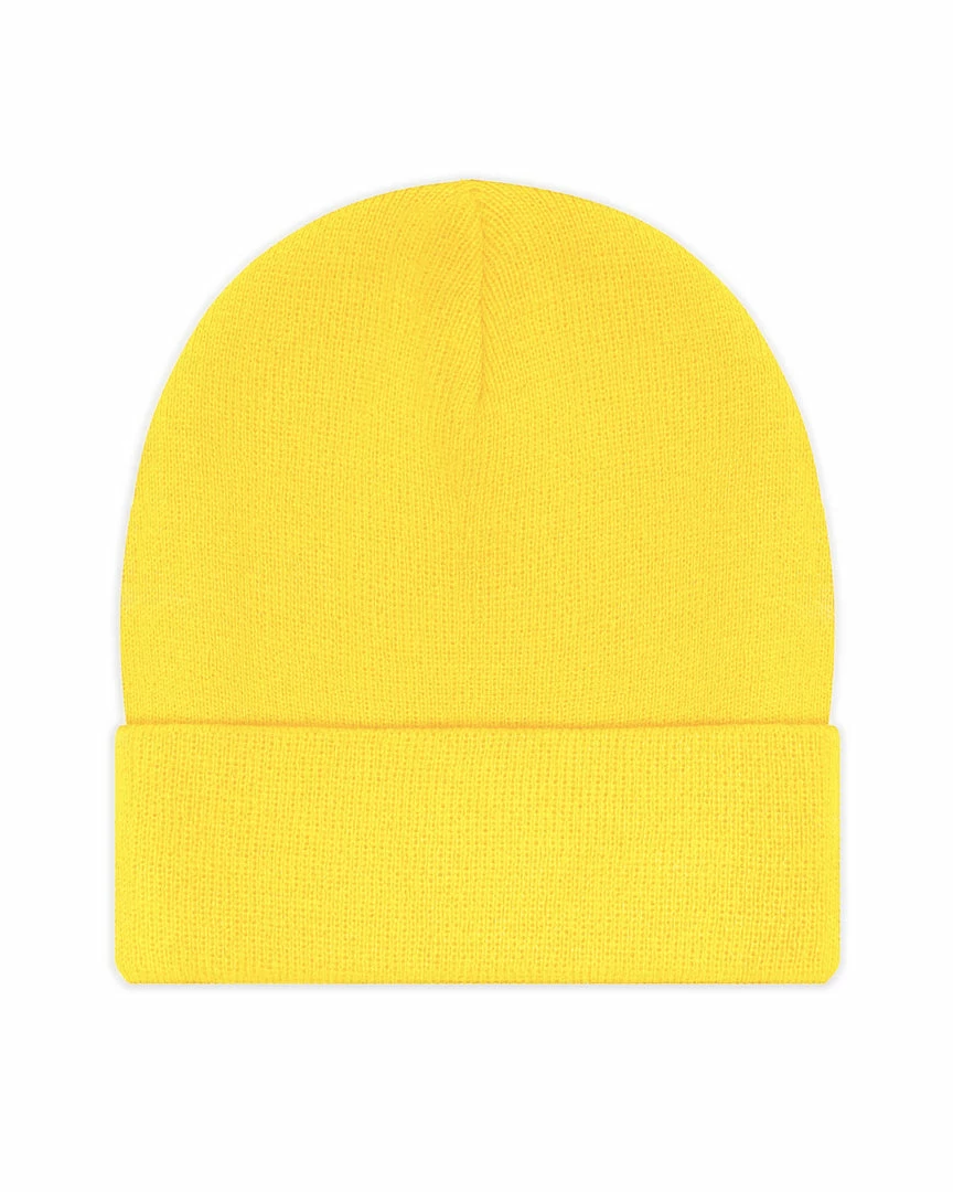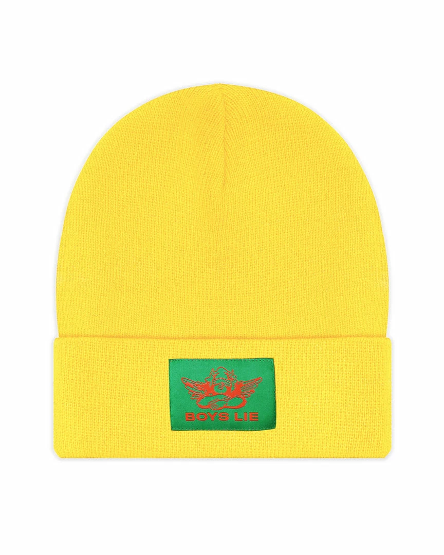 YellowΒ beanieΒ withΒ green Boys Lie logo patch.