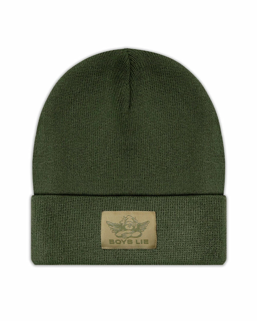 ArmyΒ greenΒ beanieΒ with light Boys Lie logo patch.