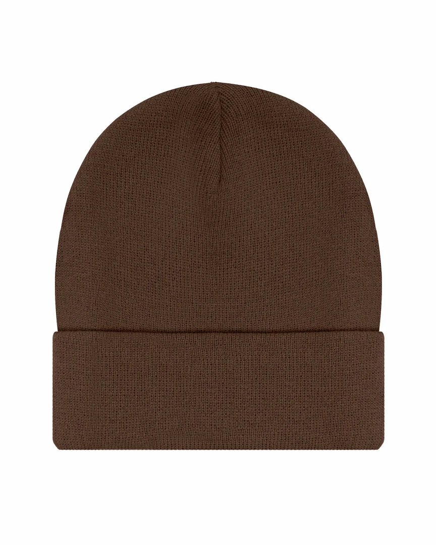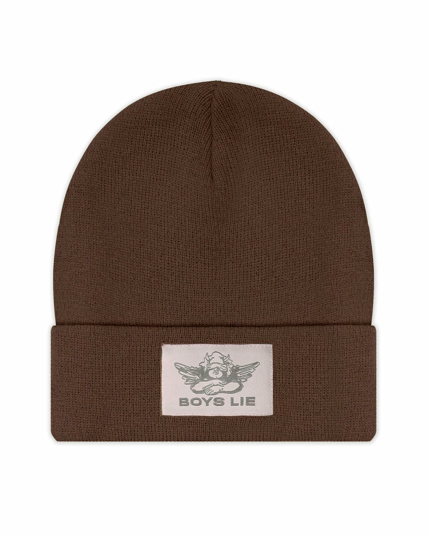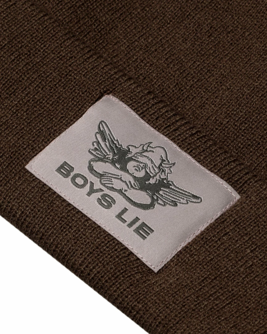 BrownΒ beanieΒ with monochromatic Boys Lie logo patch.