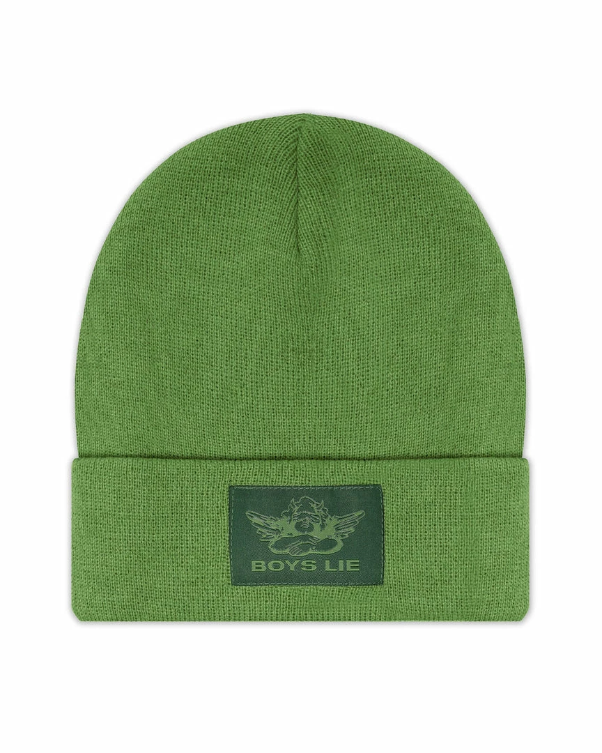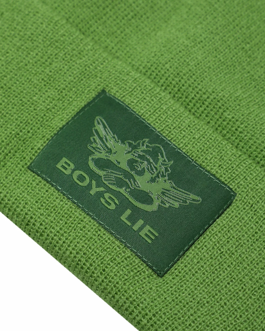 Green beanieΒ with monochromatic green Boys Lie logo patch.