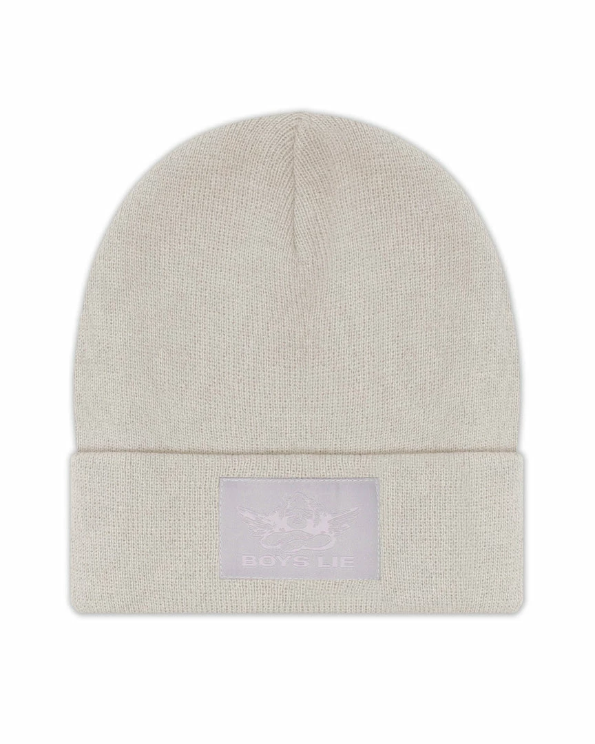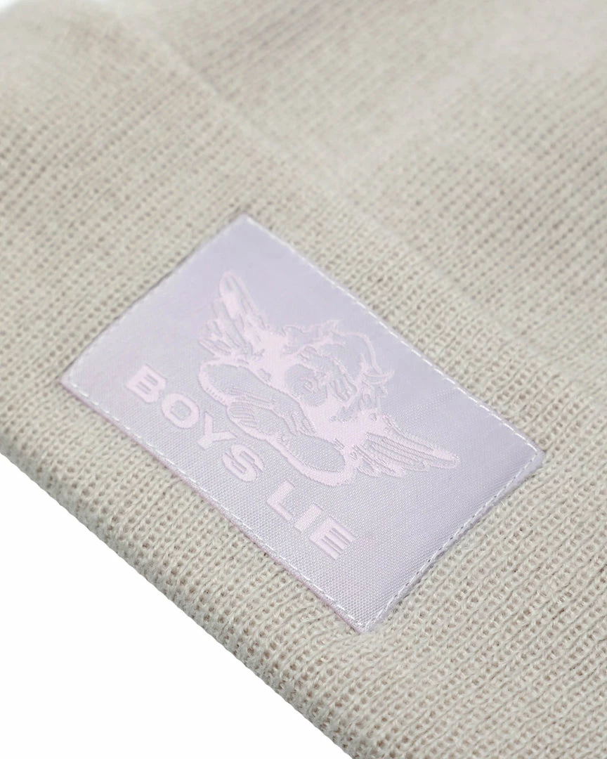 Taupe beanieΒ withΒ mauve Boys Lie logo patch.