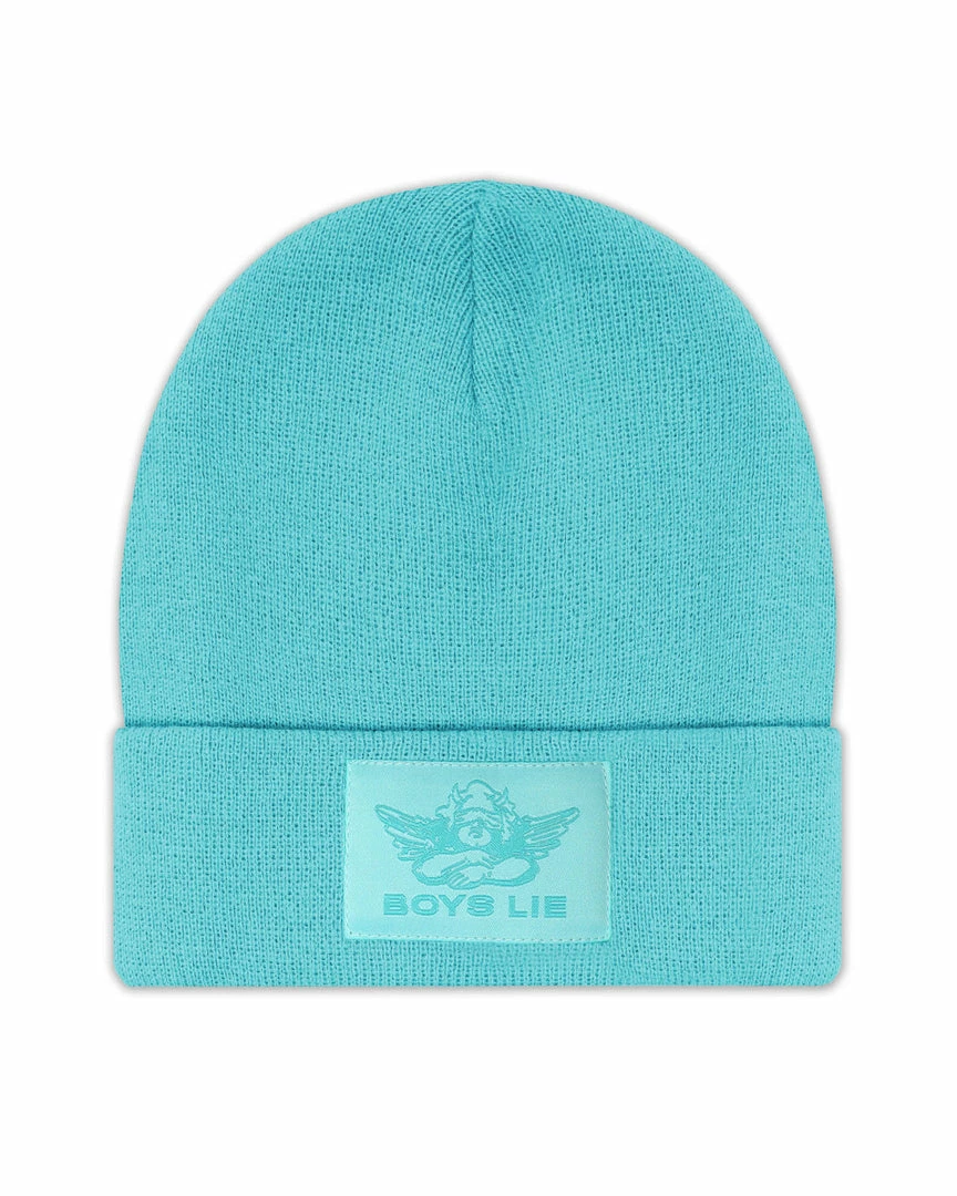 Aquamarine beanieΒ with monochromatic Boys Lie logo patch.