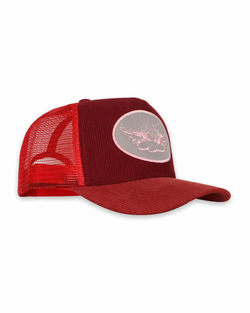 Deep redΒ trucker hat withΒ grey patch andΒ burgundy corduroy. Adjustable snapback.Β