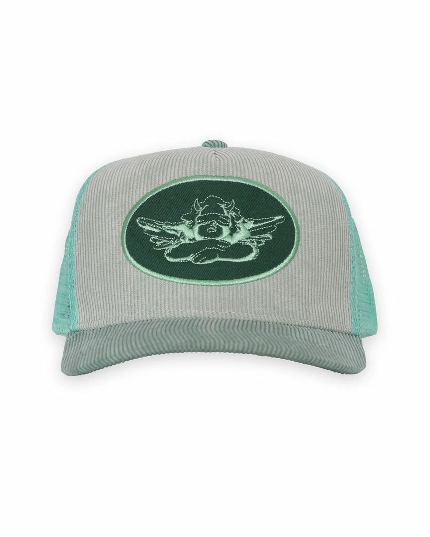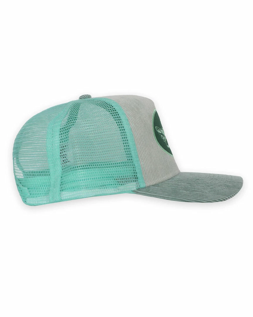 Aquamarine trucker hat with green patch and pale blue/grey corduroy. Adjustable snapback.Β
