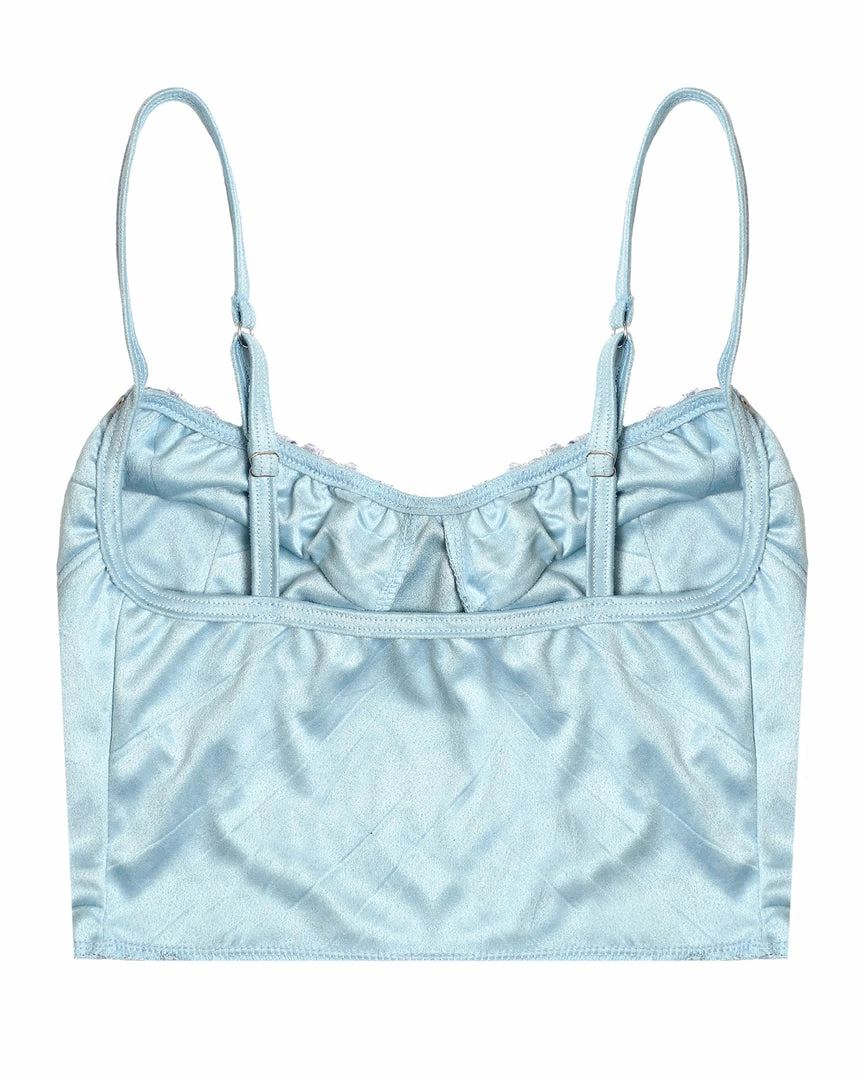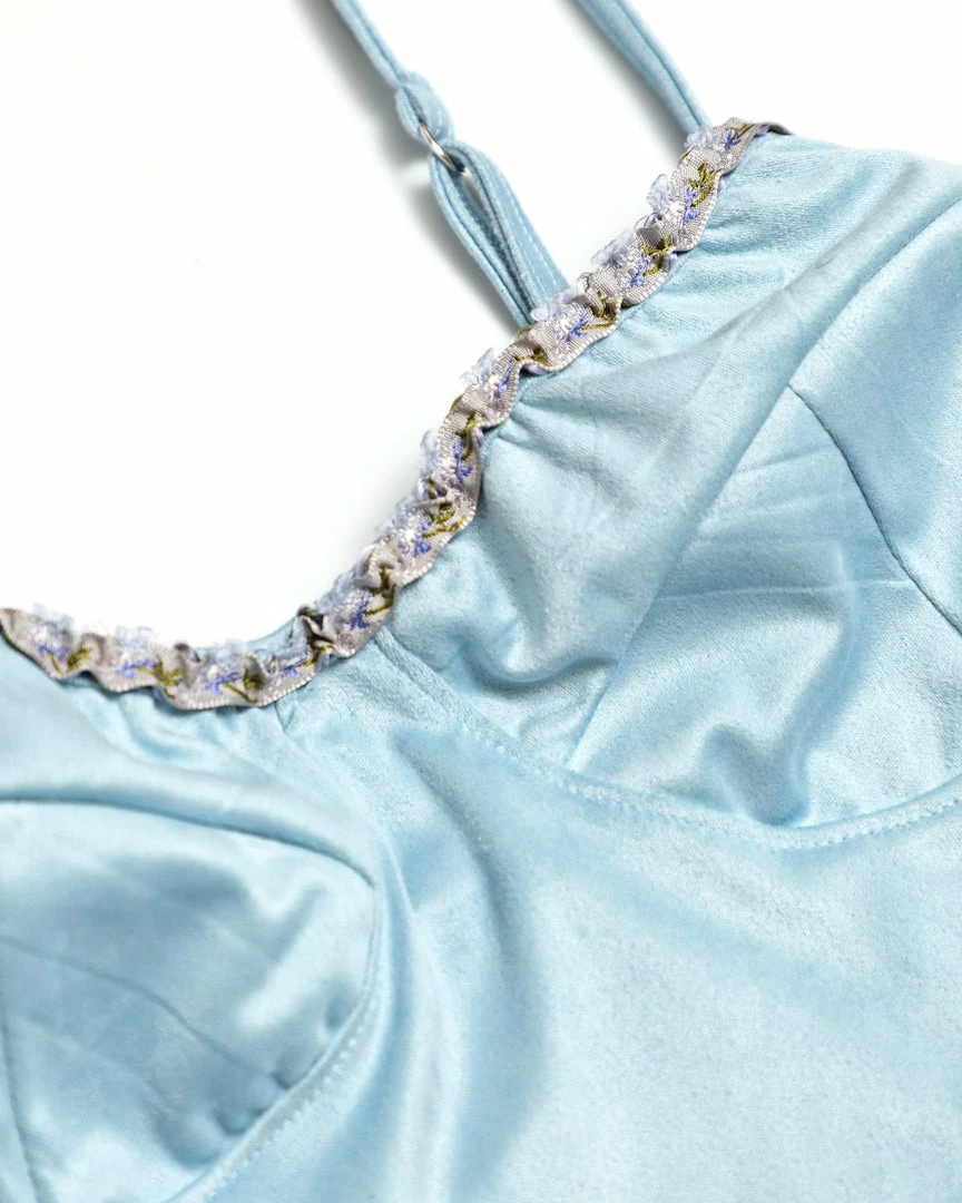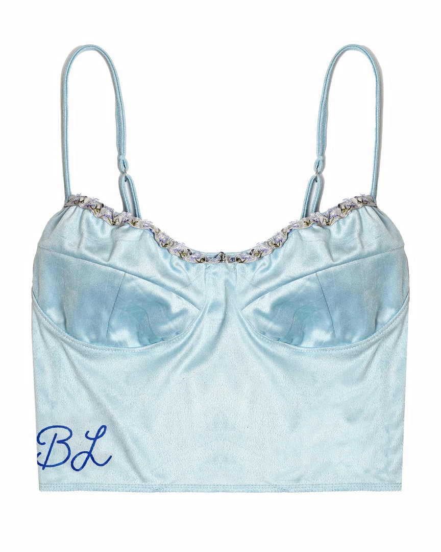 Poly suede bustier in blue withΒ floral trim. Printed “BL”, cropped hem, seam details, and adjustable straps.Β