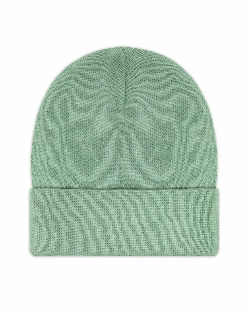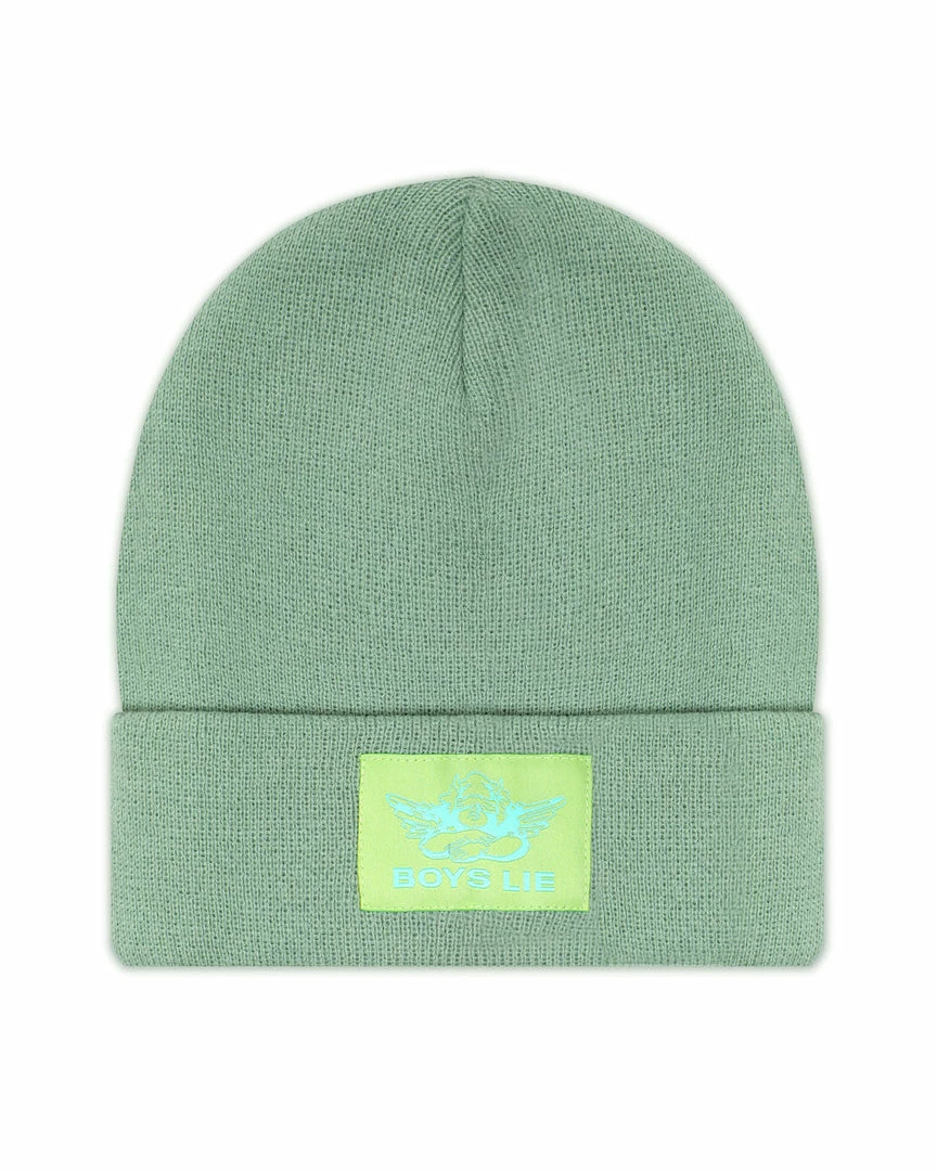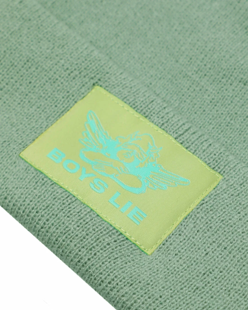 Sage greenΒ beanieΒ with monochromatic green Boys Lie logo patch.