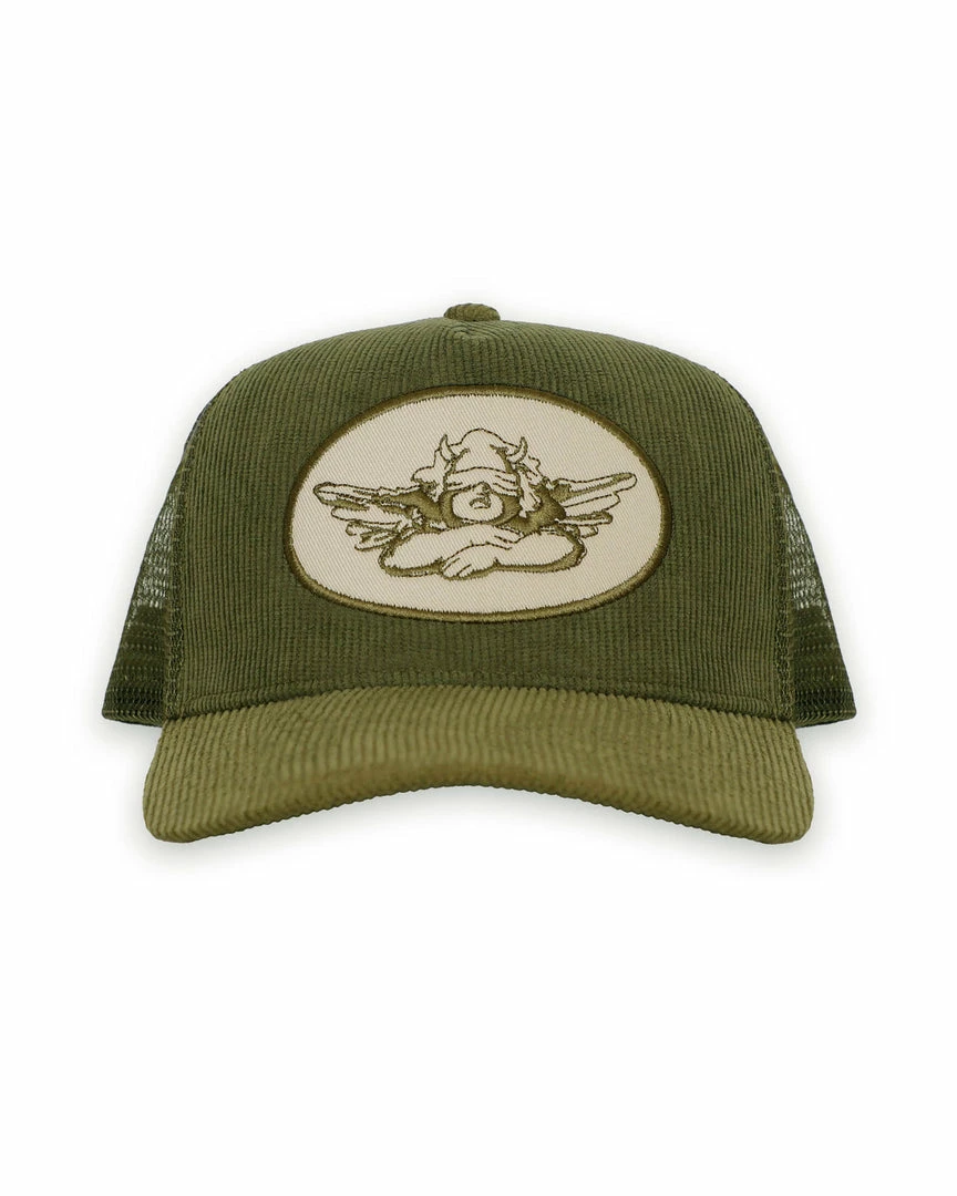 Olive greenย trucker hat withย light green patch andย olive corduroy. Adjustable snapback.ย