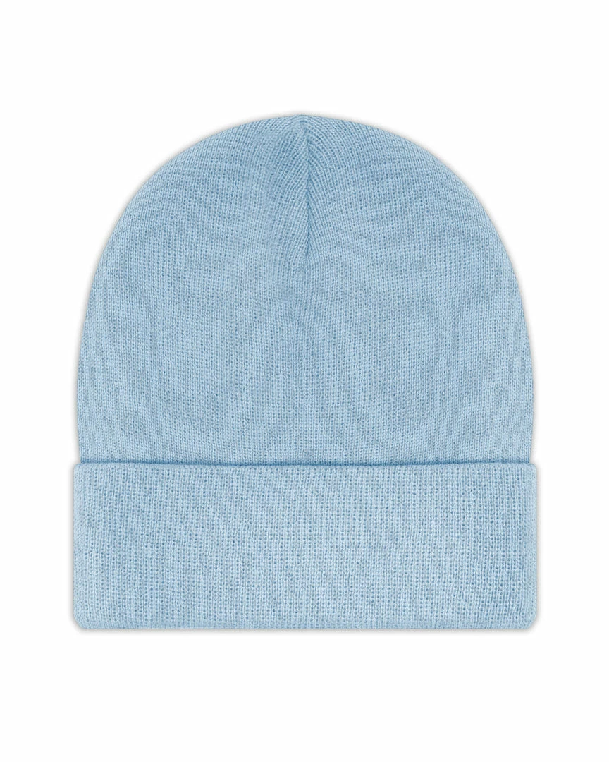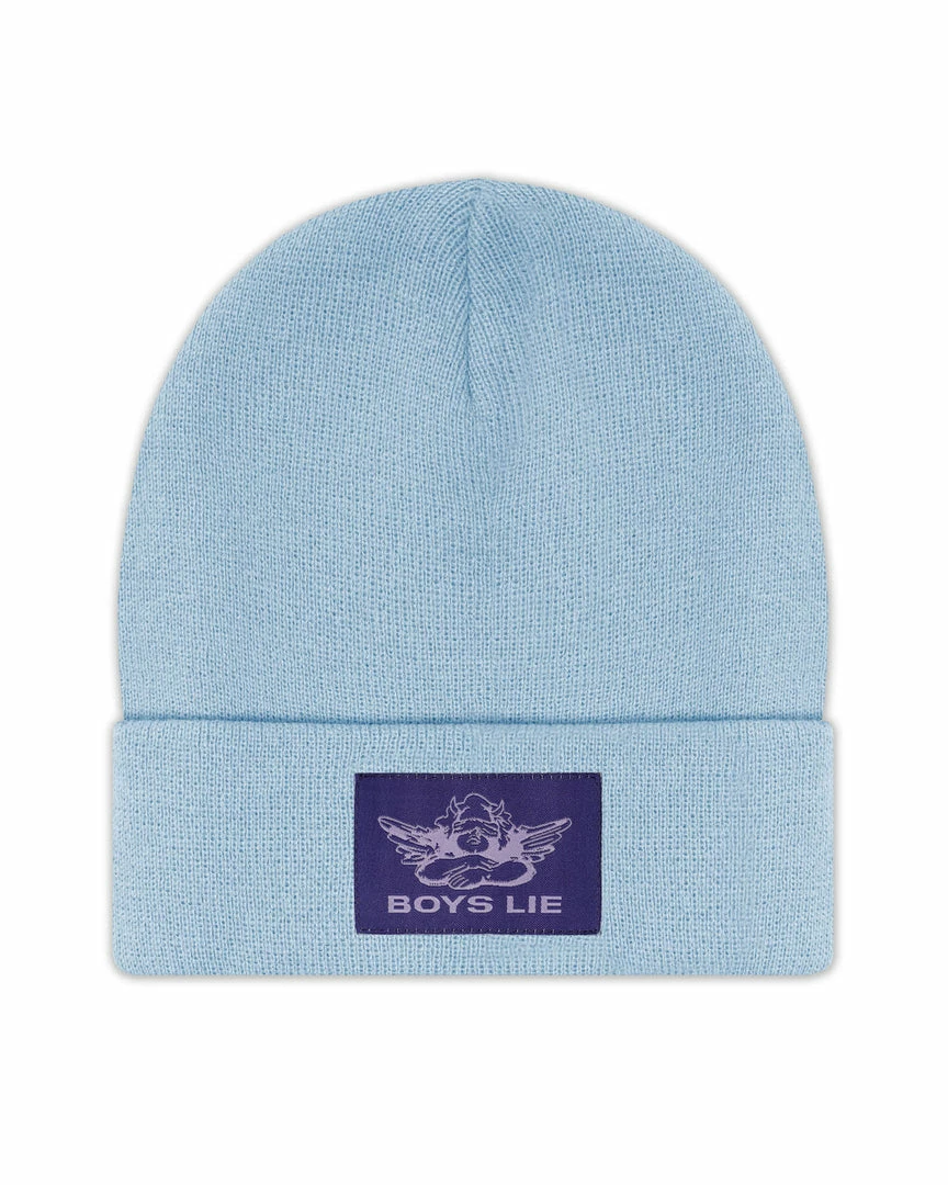 Light blueΒ beanieΒ with purple Boys Lie logo patch.