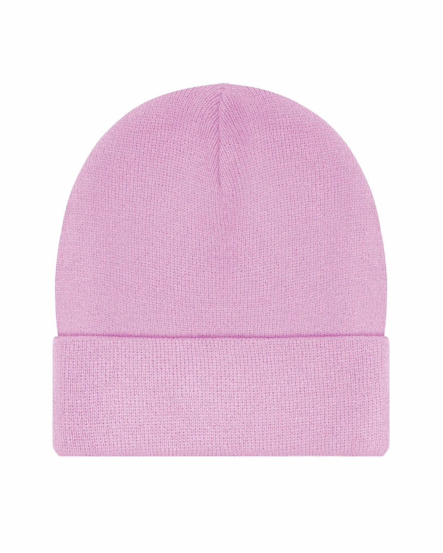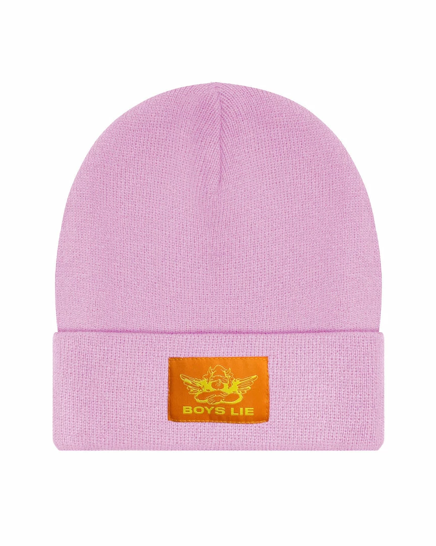 PinkΒ beanieΒ with orange Boys Lie logo patch.