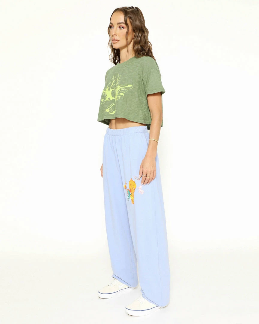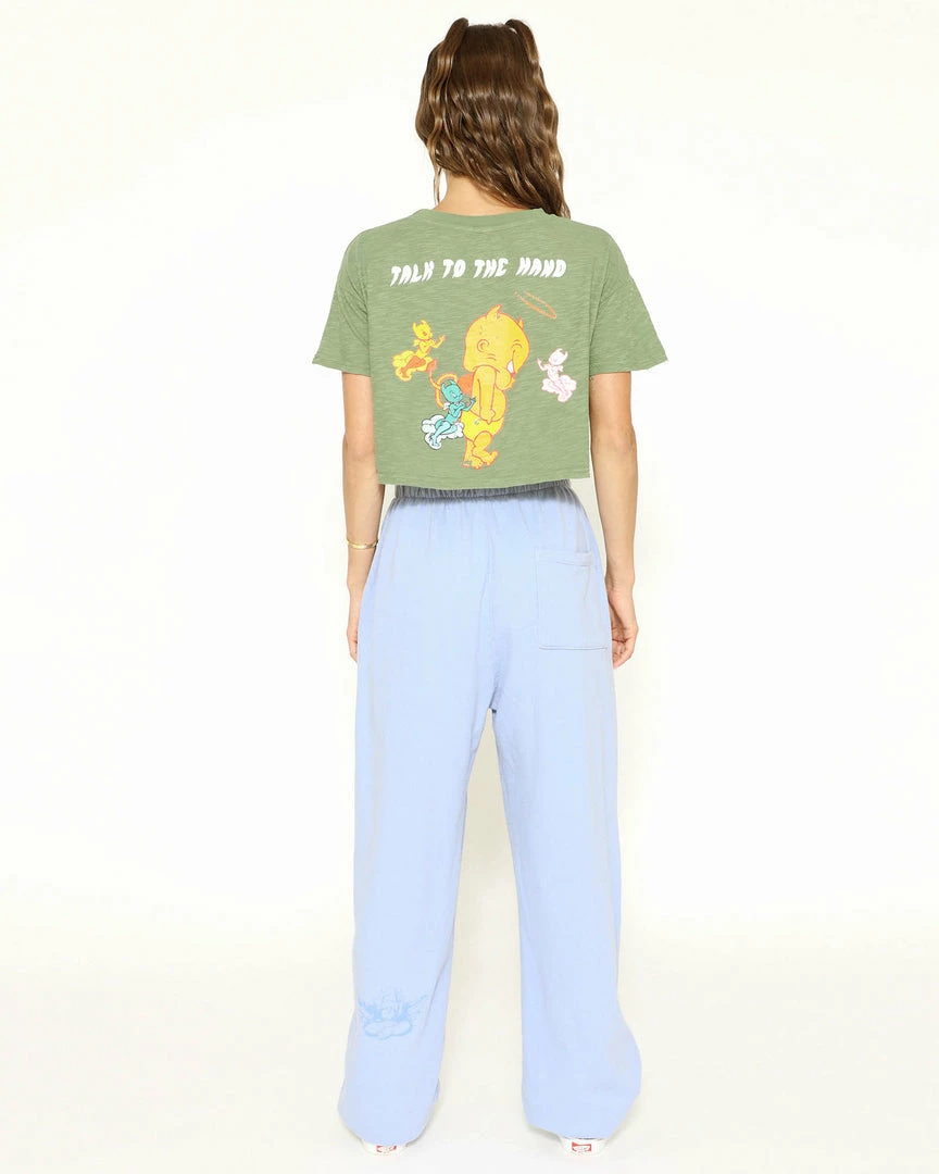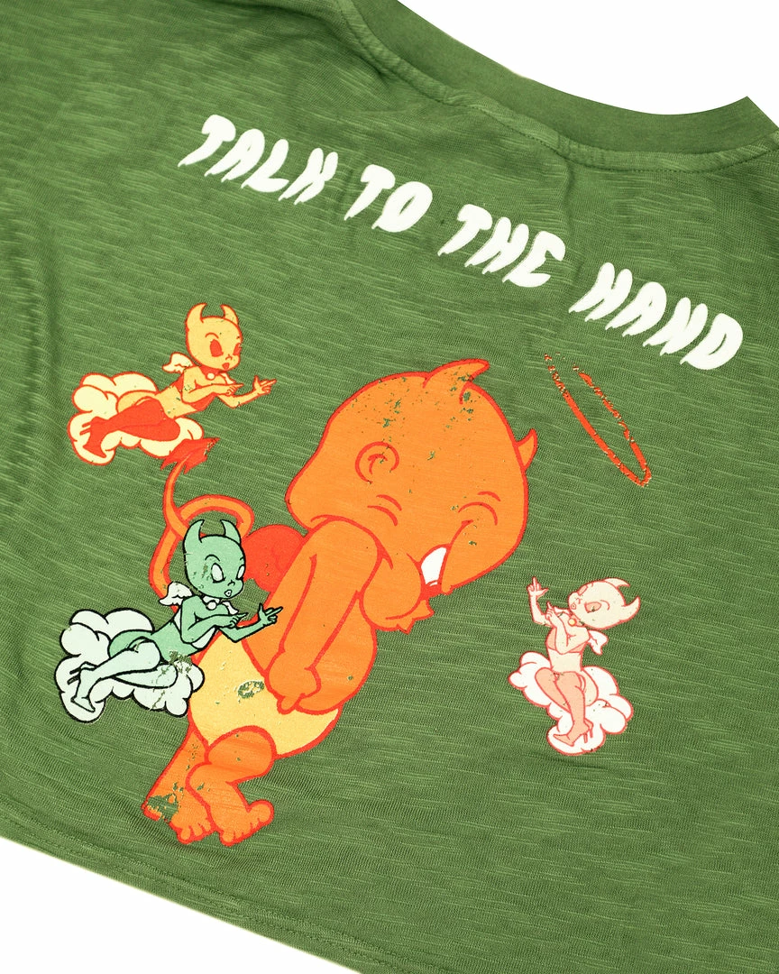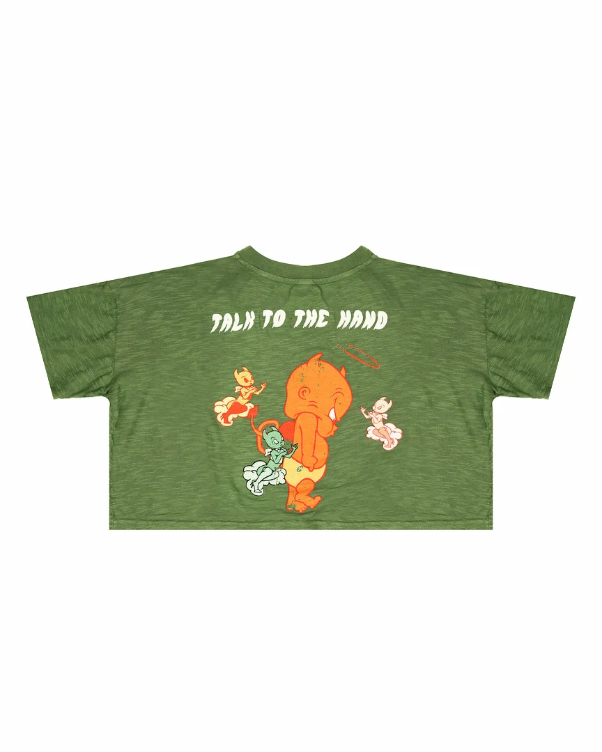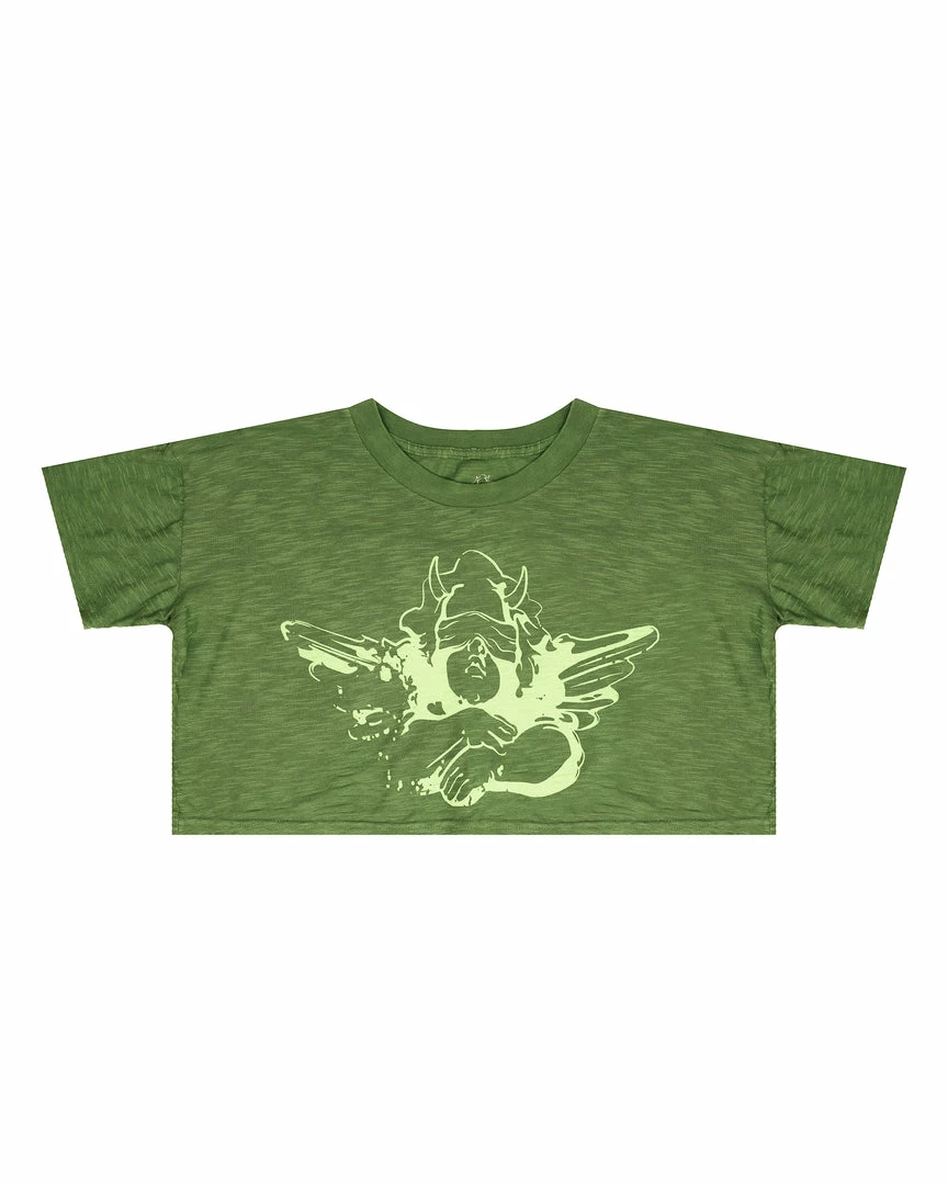 Cotton slubΒ cropped baby tee in green. Lightweight and slightly sheer with distressed graphics.Β