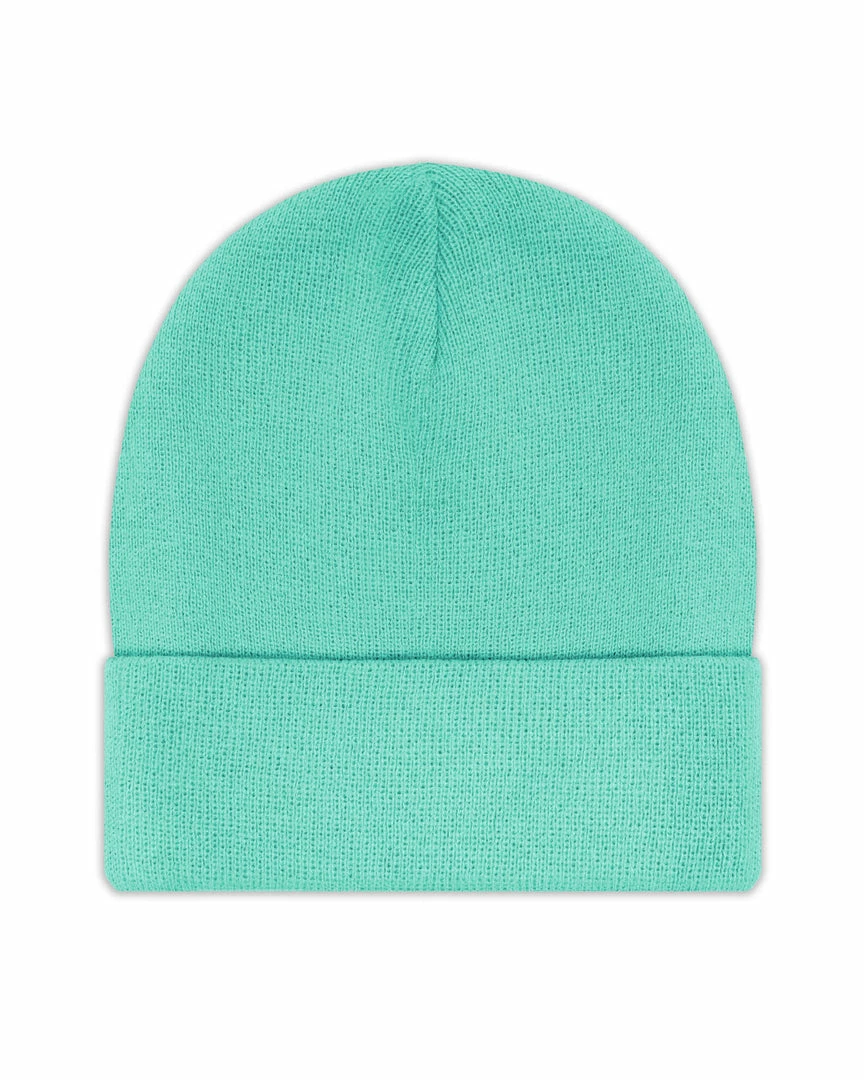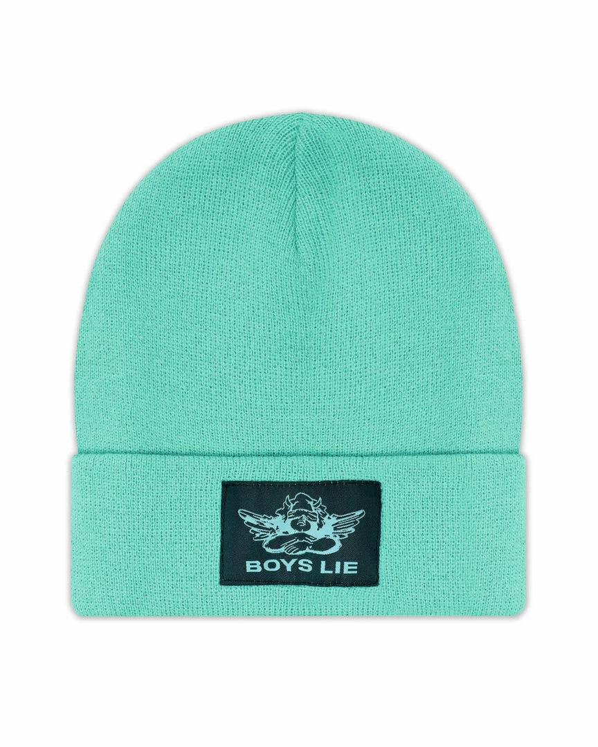 Dark mintΒ beanieΒ with monochromaticΒ teal Boys Lie logo patch.