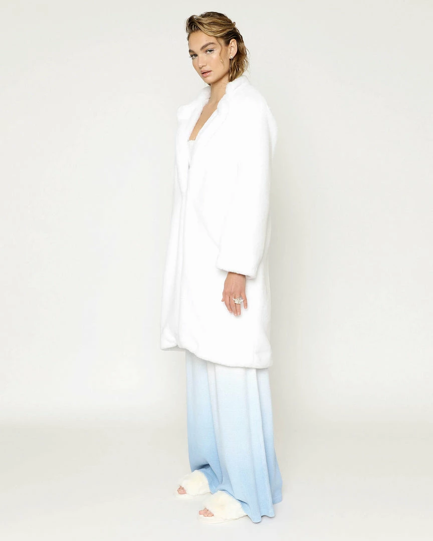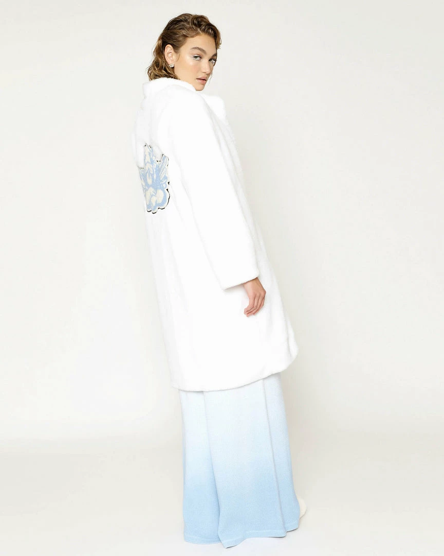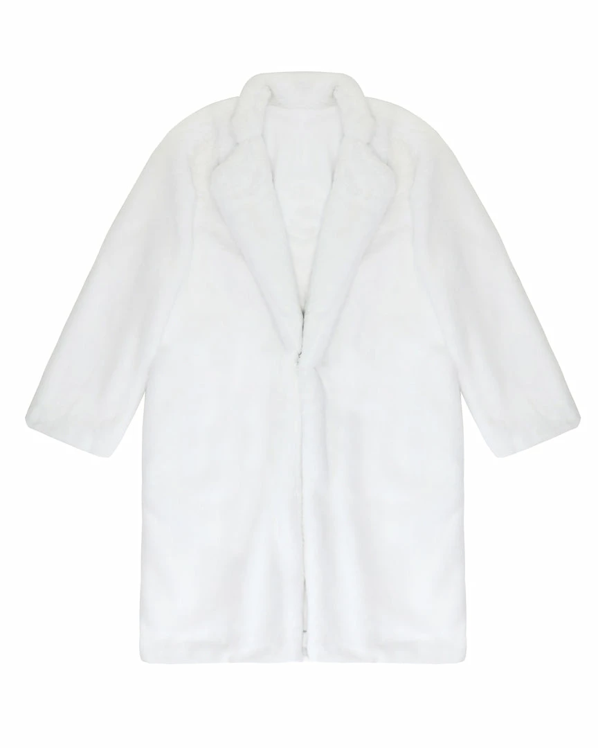 Luscious faux fur coat with collar, side pockets, and chenille logo patch.Β