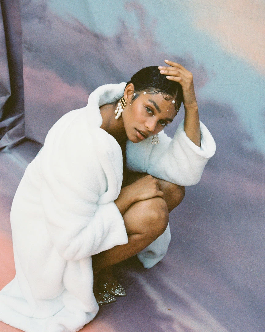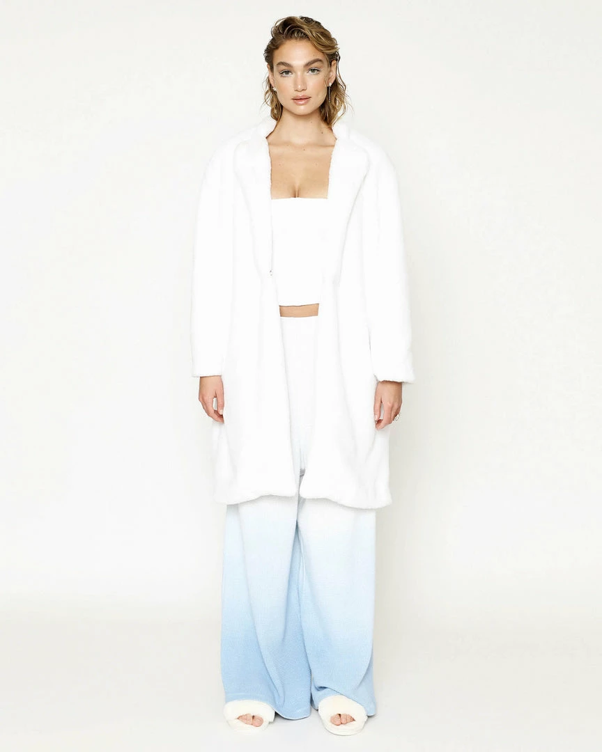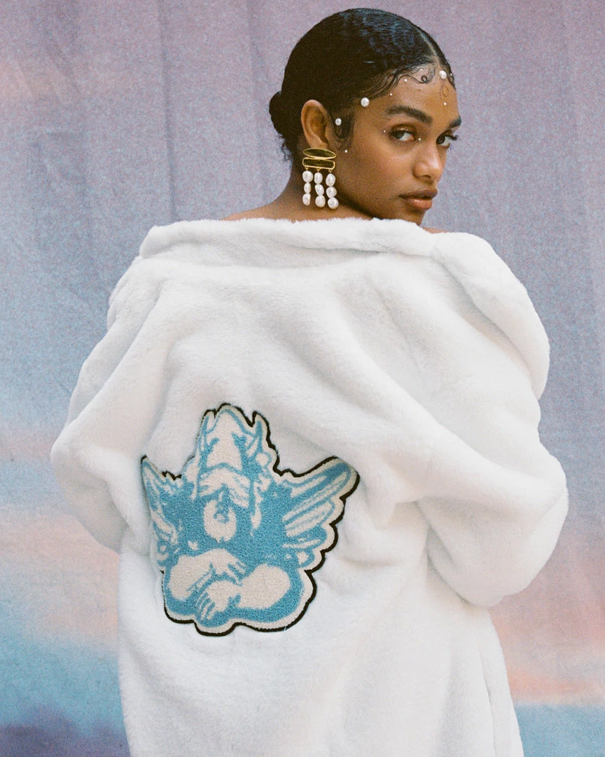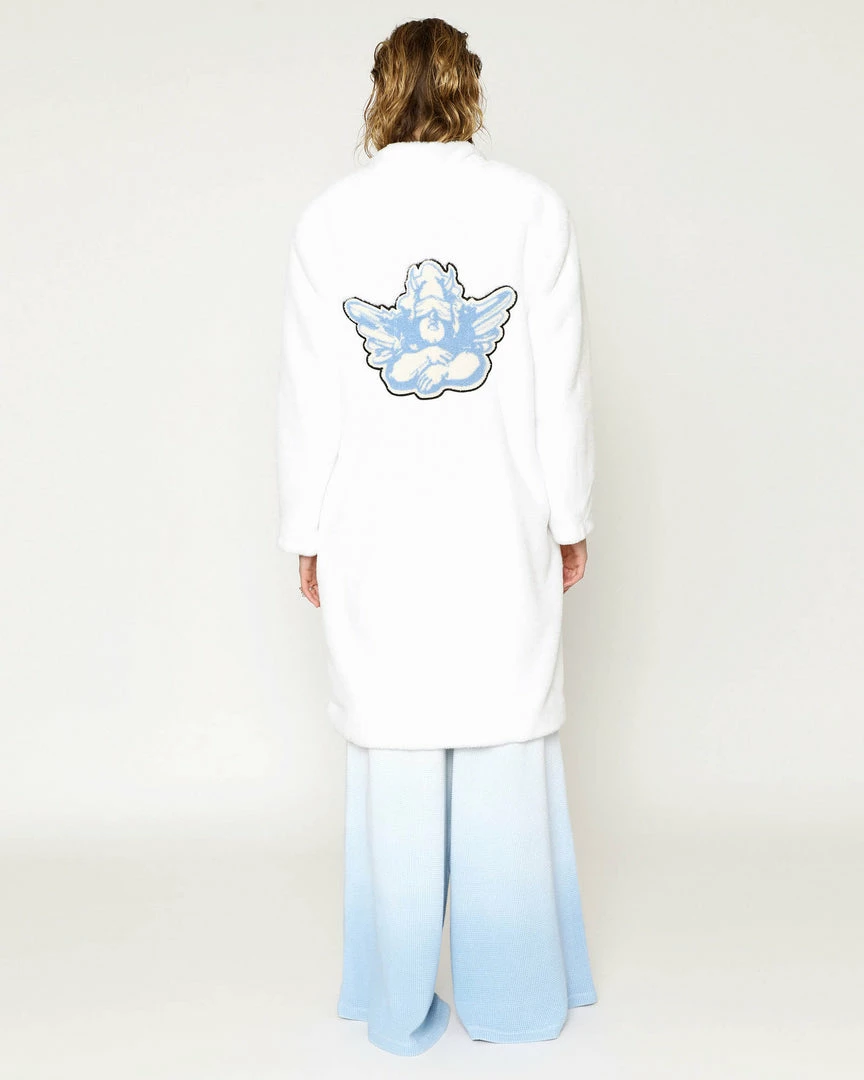 Luscious faux fur coat with collar, side pockets, and chenille logo patch.Β
